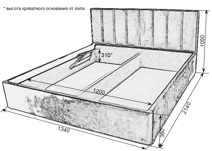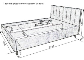 - Бельевой ящик изготовлен из фанеры 12 мм + ХДФ 4 мм. Кроватное основание изготовлено из профиля 30х30 мм с гнутоклееными ламелями комплектуются газлифтами соответствующего усилия в зависимости от размера спального места и веса матраса.