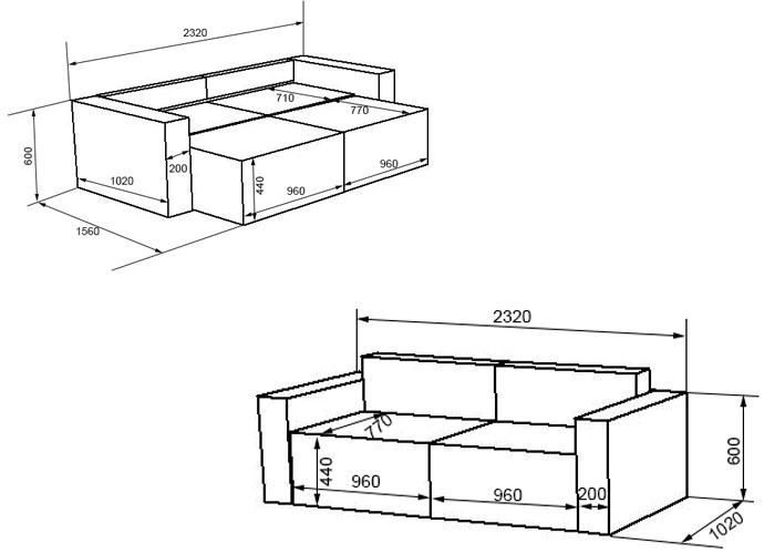 Габариты (ШхГхВ): 2320х1020/1560х790 мм, Сп.м: 1480х1920х440 мм