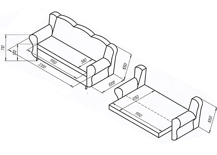 Классический диван-кровать с механизмом трансформации "книжка" на хромированных опорах. Деревянный каркас, пружинные блоки. Ящик для белья. Варианты: высокие и низкие боковины. Для изготовления на заказ необходимо выбрать обивочные ткани.
