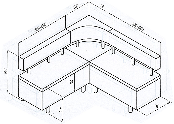 Кухонный модульный диван. Модули: поворот (50х50), кресельная часть (50 либо 60) и диванная часть ( 70 - 140 см). Сидушка поднимается механизмом "микролифт", открывая ящик. Полочка за спинкой поворотного элемента. Варианты комплектации: диван либо угловой диван. Для изготовления на заказ необходимо выбрать обивочные ткани.