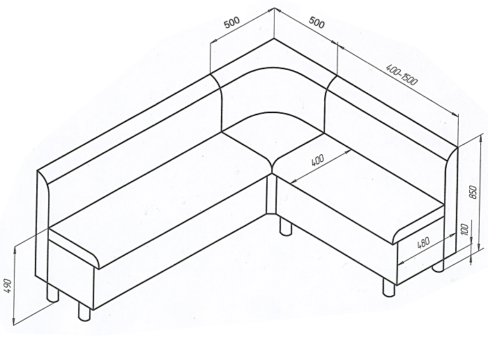 Кухонный модульный диван. Модули: поворот (50х50), кресельная часть (50 либо 60) и диванная часть ( 70 - 140 см). Сидушка поднимается механизмом "микролифт", открывая ящик. Полочка за спинкой поворотного элемента. Варианты комплектации: диван либо угловой диван. Для изготовления на заказ необходимо выбрать обивочные ткани.