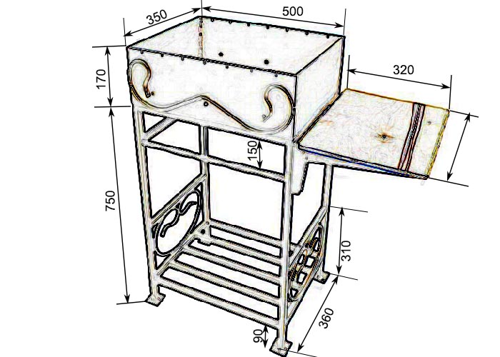 Компактный мангал из листового металла толщиной 3 мм декорирован вензелями из металического прута. Мангал оснащен витой перекладиной для гриль инструмента и откидывающимся столиком из фанеры 12 мм на кронштейнах. Удобство и красота в одном продукте!
